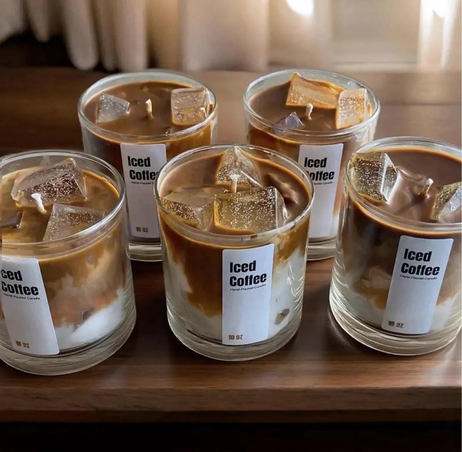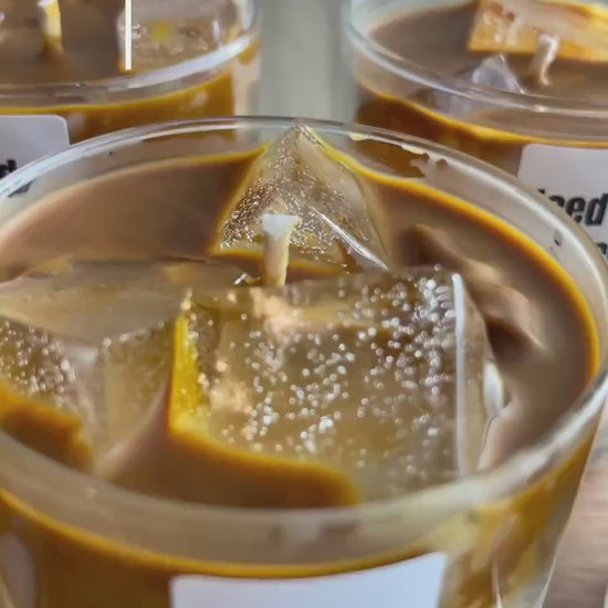 Capture the aroma of your favorite iced latte in candle form. This hand-poured soy blend candle is designed to look like a real iced coffee, complete with wax ice cubes and a creamy top.