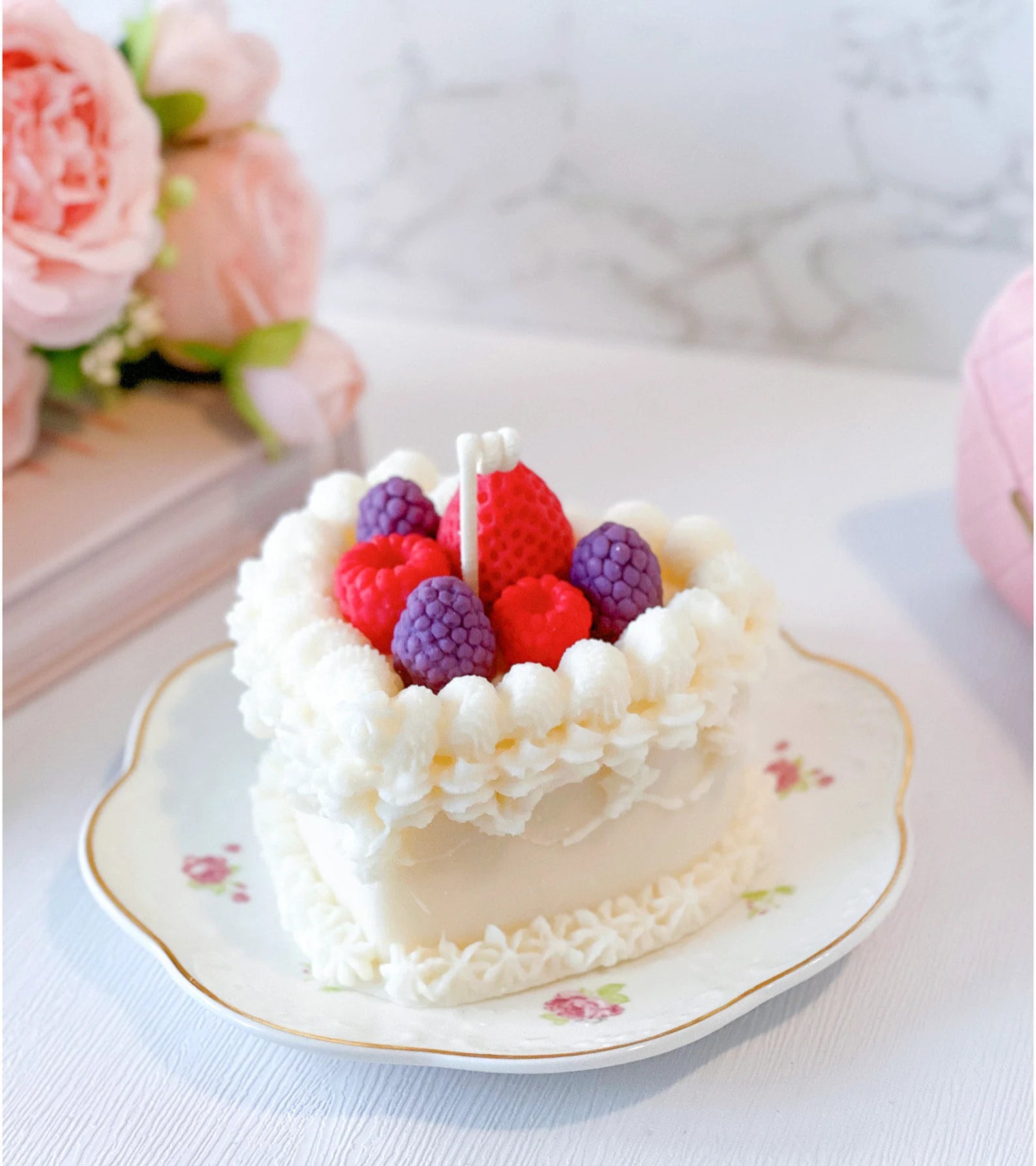 Designed to look like a slice of berry-topped cake, this handcrafted candle is both a visual treat and a fragrant delight. Each candle is uniquely made, with sweet wild berry notes and a cake-like pillar soy wax base.
